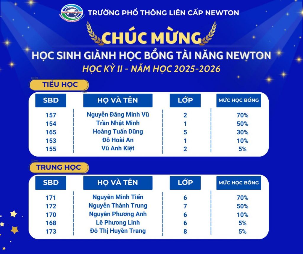 Trường PTLC Newton trân trọng thông báo kết quả Kỳ thi Học bổng Tài năng Newton – Học kỳ II năm học 2025-2026, được tổ chức vào ngày 20/12/2025.